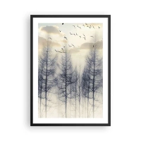 Affiche dans un cadre noir - Poster - Une forêt brumeuse avec de grands arbres et des oiseaux volants le matin - 50x70cm - L'âme de la forêt - Décoration murale moderne pour le salon et la chambre ARTTOR