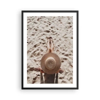 Affiche dans un cadre noir - Poster - Personne prenant un bain de soleil sur la plage, vue de dessus avec un grand chapeau contre le sable - 50x70cm - Moment de rêve - Décoration murale moderne pour le salon et la chambre ARTTOR