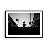 Affiche dans un cadre noir - Poster - Une figure de femme dans les escaliers en noir et blanc avec une atmosphère dynamique - 70x50cm - Pèlerinage urbain - Décoration murale moderne pour le salon et la chambre ARTTOR
