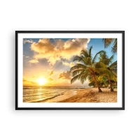 Affiche dans un cadre noir - Poster - Plage avec palmiers et coucher de soleil sur l'océan - 70x50cm - Été éternel, toujours des vacances - Décoration murale moderne pour le salon et la chambre ARTTOR