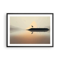 Affiche dans un cadre noir - Poster - Un oiseau sur une île dans un lac calme aux teintes chaudes - 70x50cm - Le seigneur du lac - Décoration murale moderne pour le salon et la chambre ARTTOR