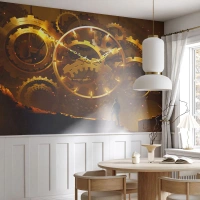 Papier Peint Photo Premium Sand - Mécanismes d'horlogerie dorés avec une figure en arrière-plan dans un style steampunk - 100x70cm - À la source du temps - Décoration murale moderne pour le salon et la chambre ARTTOR
