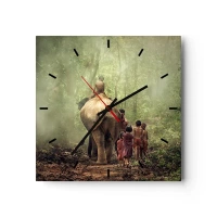 Horloge murale - Pendule murale - Enfants avec un éléphant dans une forêt verte à la lumière du matin - 30x30cm - Nouveau livre de la jungle - Décoration murale moderne pour le salon et la chambre ARTTOR