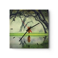 Horloge murale - Pendule murale - Un moine en robe orange dans une forêt avec un fond brumeux et un reflet dans l'eau. - 30x30cm - En route vers l'illumination - Décoration murale moderne pour le salon et la chambre ARTTOR