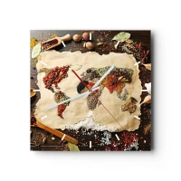Horloge murale - Pendule murale - Une carte du monde faite d'épices sur un fond en bois. - 30x30cm - Toutes les saveurs du monde - Décoration murale moderne pour le salon et la chambre ARTTOR