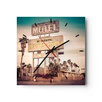 Horloge murale - Pendule murale - Panneau de motel rétro entouré de palmiers - 30x30cm - Ici, le temps s'est arrêté - Décoration murale moderne pour le salon et la chambre ARTTOR