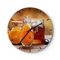 Horloge murale - Pendule murale - Une bouteille de miel avec des oranges en arrière-plan sur une table en bois - 30x30cm - Saveurs et arômes ensoleillés - Décoration murale moderne pour le salon, la cuisine et la chambre ARTTOR
