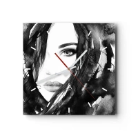 Horloge murale - Pendule murale - Visage abstrait avec des éléments contrastés et un motif d'aile - 30x30cm - Démoniaque et belle - Décoration murale moderne pour le salon et la chambre ARTTOR