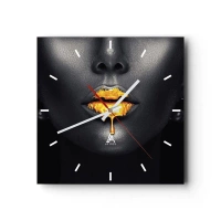 Horloge murale - Pendule murale - Portrait noir et or d'une femme avec une goutte d'or sur les lèvres - 30x30cm - Bouche d'or - Décoration murale moderne pour le salon et la chambre ARTTOR