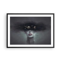 Affiche dans un cadre noir - Poster - Un visage de femme avec un motif de planète et d'espace en arrière-plan - 70x50cm - Et les planètes deviennent folles... - Décoration murale moderne pour le salon et la chambre ARTTOR