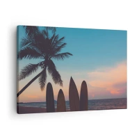 Impression sur toile - Image sur toile - Planches de surf sur fond de palmier et de coucher de soleil - 70x50cm - Demain sera amusant aussi - Décoration murale moderne pour le salon et la chambre ARTTOR
