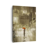 Impression sur toile - Image sur toile - Une silhouette avec un parapluie rouge dans une ville pluvieuse - 50x70cm - Seule mais pas solitaire - Décoration murale moderne pour le salon et la chambre ARTTOR