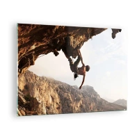 Impression sur verre - Image sur verre - Escalader un rocher vertical dans un paysage de montagne - 70x50cm - Le monde rétréci dans une main sur une coupe de rocher - Décoration murale moderne pour le salon et la chambre ARTTOR