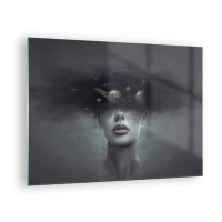 Impression sur verre - Image sur verre - Une femme avec des planètes pour tête dans une composition surréaliste - 70x50cm - Et les planètes deviennent folles... - Décoration murale moderne pour le salon et la chambre ARTTOR