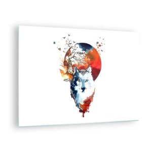 Impression sur verre - Image sur verre - Illustration d'un loup avec une pleine lune en arrière-plan - 70x50cm - Nez à nez avec la nuit - Décoration murale moderne pour le salon et la chambre ARTTOR