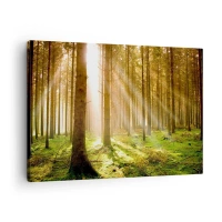 Impression sur toile - Image sur toile - Forêt de conifères avec les rayons du soleil qui brillent à travers les arbres - 70x50cm - Les elfes vont bientôt apparaître - Décoration murale moderne pour le salon et la chambre ARTTOR