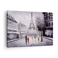 Impression sur toile - Image sur toile - Une vue de la Tour Eiffel dans un décor monochrome avec des touches de couleur - 70x50cm - Balade parisienne - Décoration murale moderne pour le salon et la chambre ARTTOR