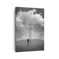 Impression sur toile - Image sur toile - Une personne portant un manteau rouge et une échelle menant à un nuage - 50x70cm - Tout est possible - Décoration murale moderne pour le salon et la chambre ARTTOR