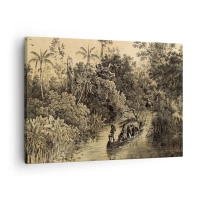 Impression sur toile - Image sur toile - Dessin d'une jungle avec un bateau sur une rivière - 70x50cm - Expédition à la source - Décoration murale moderne pour le salon et la chambre ARTTOR