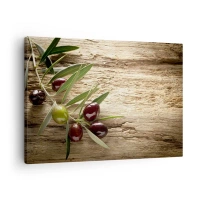 Impression sur toile - Image sur toile - Branche d'olivier avec des fruits sur un fond de bois vieilli - 70x50cm - Directement de la nature - Décoration murale moderne pour le salon et la chambre ARTTOR