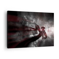 Impression sur toile - Image sur toile - Saxophoniste en fumée sur scène en noir et rouge atmosphérique - 70x50cm - Dans les brumes du jazz - Décoration murale moderne pour le salon et la chambre ARTTOR