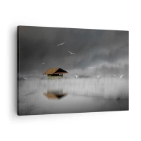 Impression sur toile - Image sur toile - Un chalet solitaire sur l'eau entouré de brouillard et d'oiseaux - 70x50cm - A l'abri de la pluie - Décoration murale moderne pour le salon et la chambre ARTTOR