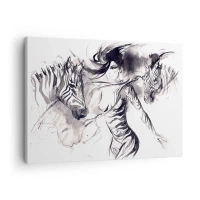 Impression sur toile - Image sur toile - Une femme dans une danse dynamique avec des zèbres dans une esthétique noir et blanc - 70x50cm - Danse avec les zèbres - Décoration murale moderne pour le salon et la chambre ARTTOR