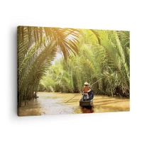 Impression sur toile - Image sur toile - Un bateau sur une rivière entourée de végétation tropicale - 70x50cm - Ravin de palmier - Décoration murale moderne pour le salon et la chambre ARTTOR