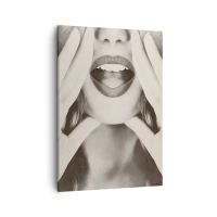 Impression sur toile - Image sur toile - Portrait noir et blanc d'une femme aux lèvres et aux mains expressives - 50x70cm - J'arrive! - Décoration murale moderne pour le salon et la chambre ARTTOR