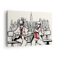 Impression sur toile - Image sur toile - Un duo de jazz avec saxophone et guitare sur fond de ville - 70x50cm - improvisation new-yorkaise - Décoration murale moderne pour le salon et la chambre ARTTOR