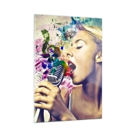 Impression sur verre - Image sur verre - Une composition colorée d'une femme chantant dans un microphone. - 50x70cm - Peindre le monde avec sa voix - Décoration murale moderne pour le salon et la chambre ARTTOR