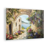 Impression sur verre - Image sur verre - Une rue pittoresque avec vue sur le lac - 70x50cm - Le charme d'une province côtière - Décoration murale moderne pour le salon et la chambre ARTTOR