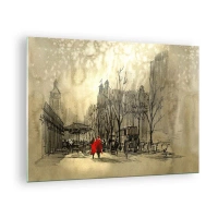 Impression sur verre - Image sur verre - Un rendez-vous dans le brouillard londonien avec un accent de manteau rouge - 70x50cm - Rendez-vous dans le brouillard de Londres - Décoration murale moderne pour le salon et la chambre ARTTOR