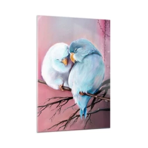 Impression sur verre - Image sur verre - Deux tourtereaux assis sur une branche sur fond rose - 50x70cm - Que dire de plus?... - Décoration murale moderne pour le salon et la chambre ARTTOR