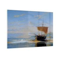 Impression sur verre - Image sur verre - Un navire avec une voile au bord de la mer dans un style pictural - 70x50cm - Eau, terre, air - Décoration murale moderne pour le salon et la chambre ARTTOR