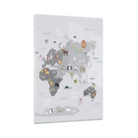 Impression sur verre - Image sur verre - Carte du monde illustrée avec des animaux caractéristiques - 50x70cm - Dis-moi d'où tu viens... - Décoration murale moderne pour le salon et la chambre ARTTOR