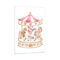 Impression sur verre - Image sur verre - Un carrousel rose avec des chevaux de style enfantin sur fond blanc - 50x70cm - Le doux monde de l'enfance - Décoration murale moderne pour le salon et la chambre ARTTOR