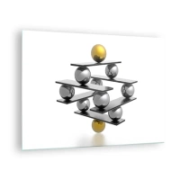 Impression sur verre - Image sur verre - Composition géométrique avec des boules et des plateformes sur fond blanc - 70x50cm - Balance d'or et d'argent - Décoration murale moderne pour le salon et la chambre ARTTOR