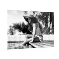 Impression sur verre - Image sur verre - Femme portant un chapeau assise au bord de la piscine en noir et blanc - 70x50cm - Rêve d'été - Décoration murale moderne pour le salon et la chambre ARTTOR