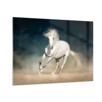Impression sur verre - Image sur verre - Un cheval blanc galopant sur le sable contre un ciel sombre. - 70x50cm - La liberté à l'état pur - Décoration murale moderne pour le salon et la chambre ARTTOR