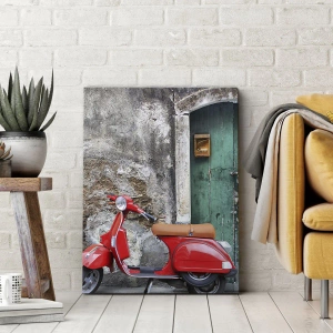 - Le tableau représente un scooter rouge garé devant une porte verte vieillie, entourée de plantes. Ce motif évoque l'atmosphère rétro et le charme d'une rue italienne, s'intégrant parfaitement aux intérieurs élégants.