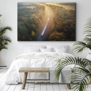La toile « Voyage d'automne » est une scène unique, pleine de charme et de paix. Elle représente un train traversant une forêt automnale à l'aube, entouré des couleurs chaudes des feuilles et d'un léger brouillard. La vue plongeante met en valeur la beauté du paysage, créant une atmosphère d'harmonie et de tranquillité.
