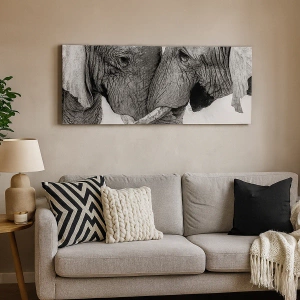 - Deux éléphants dans un geste tendre, présentés dans des tons monochromes. Un tableau unique qui apporte harmonie et élégance à tout intérieur.