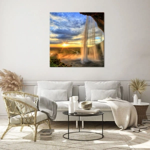 Impression sur verre - Image sur verre - Cascade avec vue sur le coucher de soleil et la vallée - 70x50cm - Le monde derrière un voile de gouttes - Décoration murale moderne pour le salon et la chambre ARTTOR