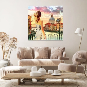 Les couleurs du tableau sont basées sur des nuances chaudes d'orange, d'or et de rose, qui confèrent à la composition profondeur et subtilité. Des détails tels que la lumière délicate se reflétant sur l'eau et l'ornementation architecturale des bâtiments soulignent l'expression artistique de l'œuvre. C'est un choix parfait pour les amoureux de paysages romantiques et ceux qui apprécient l'élégance artistique.