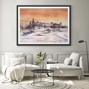 Affiche dans un cadre noir - Poster - Coucher de soleil sur le château dans un paysage hivernal - 70x50cm - Coucher de soleil royal - Décoration murale moderne pour le salon et la chambre ARTTOR