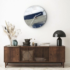 « Meeting with White » est une horloge murale moderne inspirée de l'art abstrait, dominée par de puissants coups de pinceau dans des tons de blanc et de bleu marine. La composition attire l'attention par sa simplicité et son expressivité.