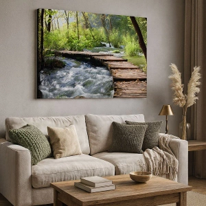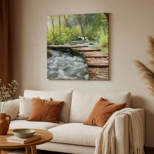 Le pont guide le regard vers le paysage, symbolisant le voyage et la découverte de nouveaux chemins. Grâce à la reproduction réaliste de détails tels que la texture du bois ou les reflets de la lumière à la surface de l'eau, le tableau donne l'impression d'une nature authentique transportée dans l'intérieur. C'est un choix idéal pour les amoureux de la nature et de l'écologie.