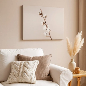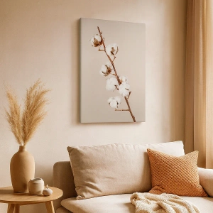 • Ce tableau représente une délicate branche de coton sur fond beige, créant une composition subtile et harmonieuse. Idéal pour les intérieurs minimalistes et élégants.