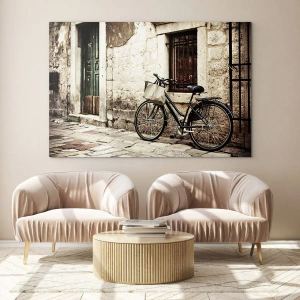 Impression sur verre - Image sur verre - Un vélo noir et blanc appuyé contre un vieil immeuble - 50x70cm - Retour au passé - Décoration murale moderne pour le salon et la chambre ARTTOR